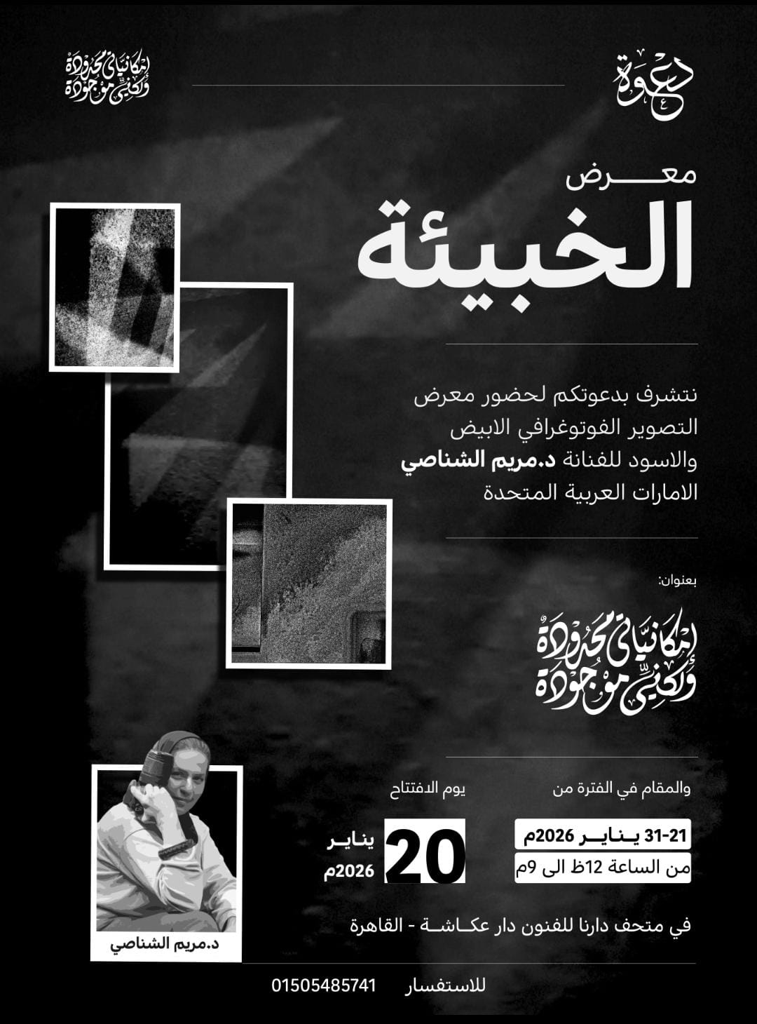 تشارك الفنانة الدكتورة مريم الشناصي من دولة الإمارات العربية المتحدة بمجموعة من الأعمال الفوتوغرافية بالأبيض والأسود، تضم 17 عملًا، في معرض يحمل اسم «الخبيئة» تحت عنوان فرعي «إمكانياتي محدودة ولكني موجودة». ويأتي اختيار الرقم 17 لما يحمله من دلالات رقمية خاصة لدى الفنانة، وارتباطه بنغمات الحياة الطبيعية وفلسفة مجاراة الصدفة باعتبارها أصدق من ألف موعد، ضمن نسق روائي بصري تستعد لإخراجه في عمل متكامل بنهاية عام 2026.
