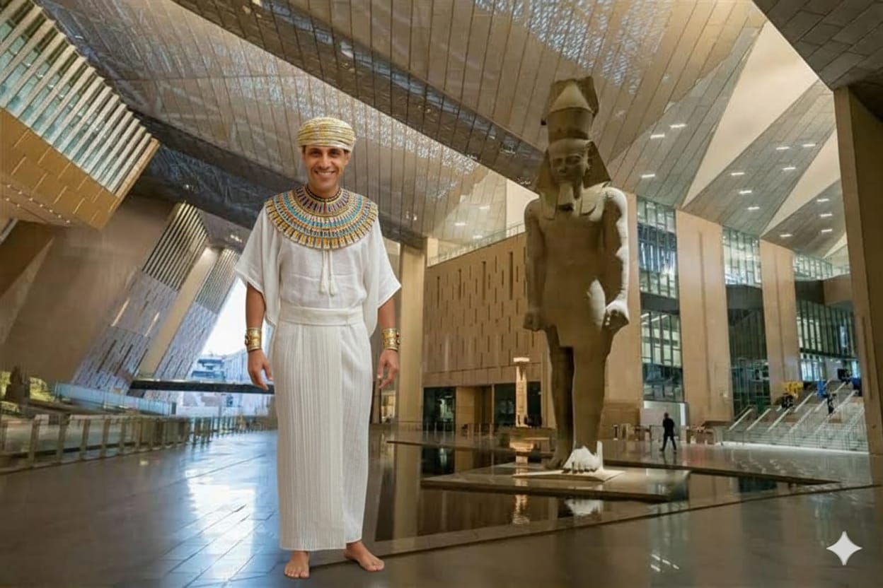 بالزي الفرعوني.. المستشار الاعلامي العماني السابق يهنىء مصر بافتتاح المتحف المصرى الكبير .
