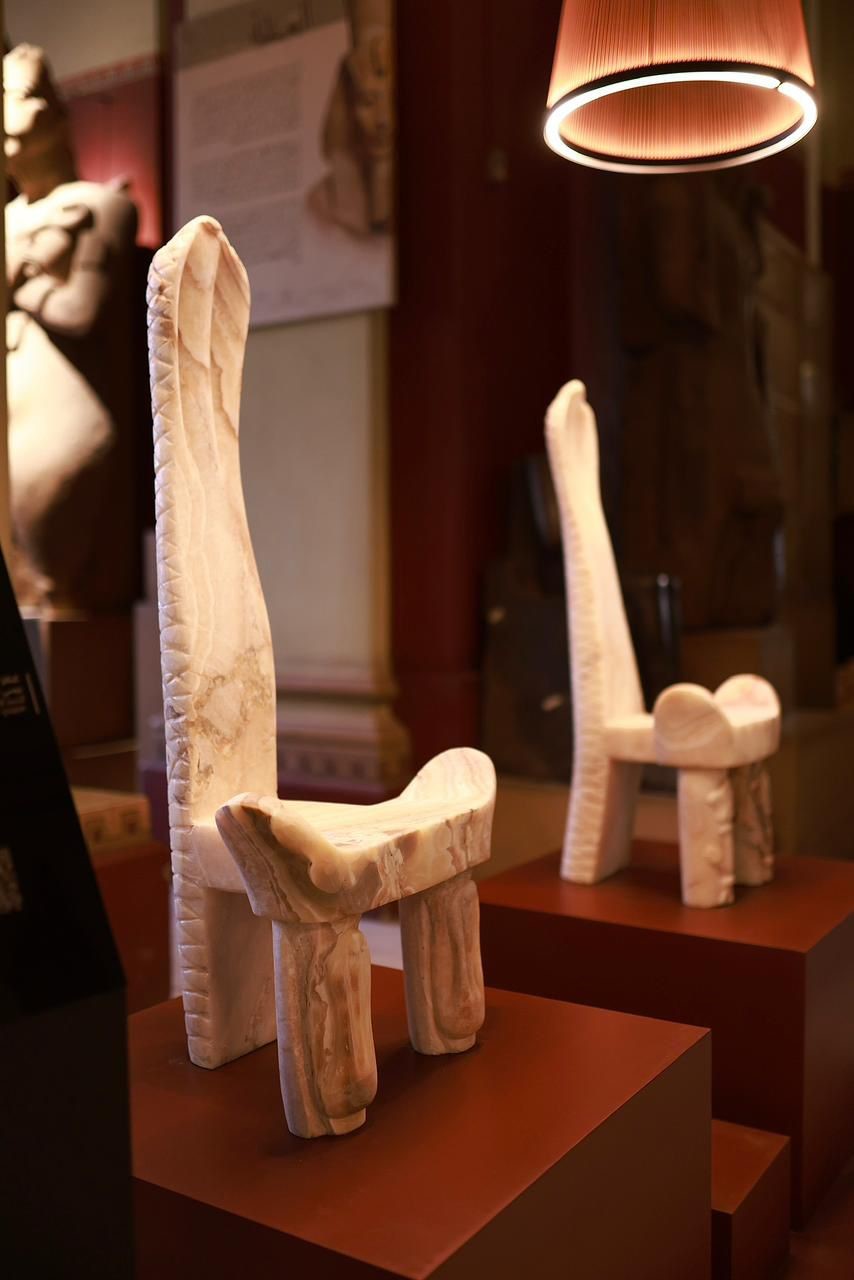 ● يقدّم الفنان والمصمّم الفرنسي–المصري–اللبناني عمر شاكيل الوكيل عمله الجديد “كرسي الولادة أورايوس” ضمن المعرض، وهو زوج من الكراسي المنحوتة يدويًا من حجر الألباستر العقيقي المصري. يُعد شاكيل من الروّاد في إدخال الألباستر إلى عالم التصميم المعاصر في مصر، وتُعرض أعماله في معارض دولية مرموقة مثل آرت بازل