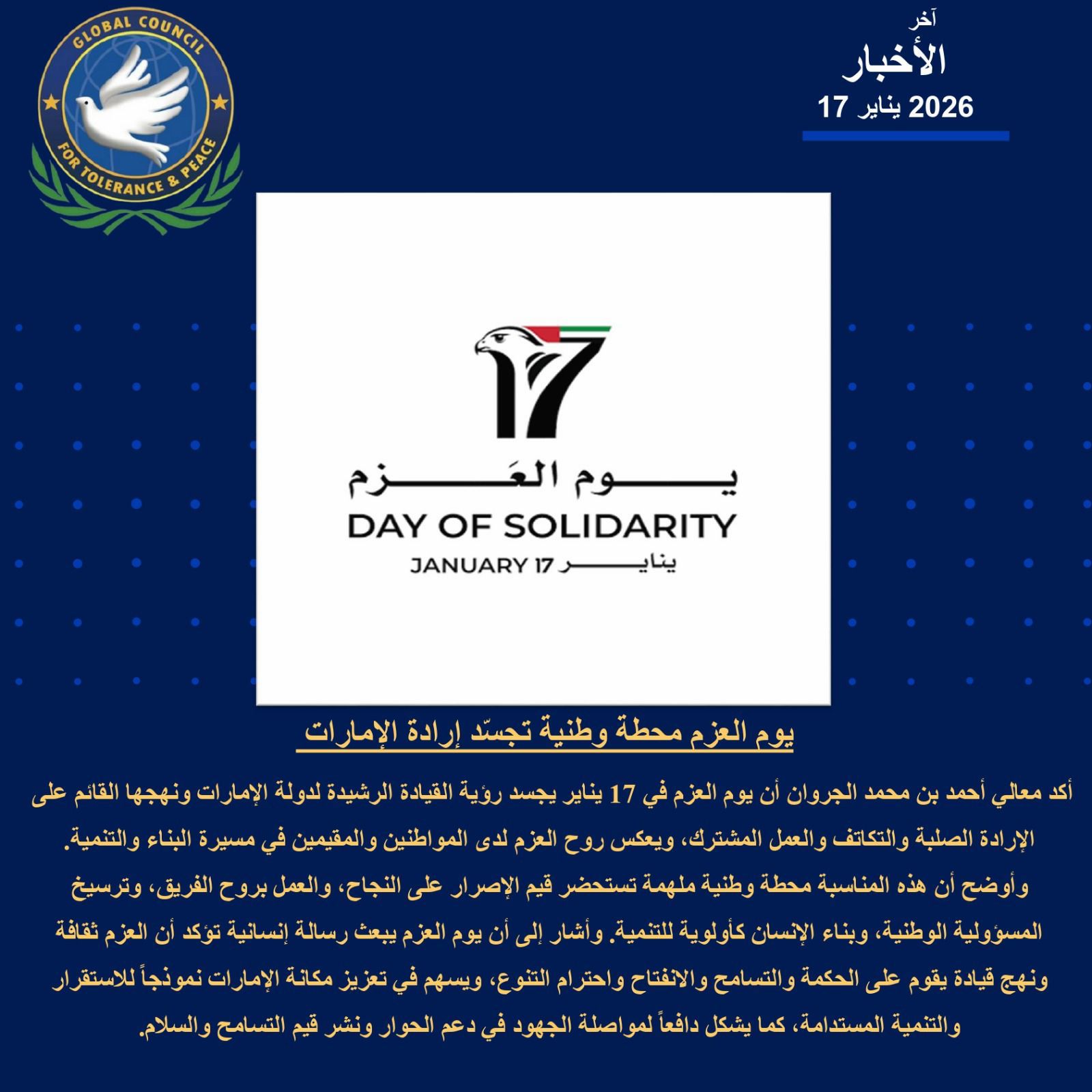 أكد أحمد بن محمد الجروان، رئيس المجلس العالمي للتسامح والسلام، أن «يوم العزم» الموافق 17 يناير من كل عام يجسّد رؤية القيادة الرشيدة لـ دولة الإمارات العربية المتحدة ونهجها القائم على الإرادة الصلبة، كما يعكس إرادة شعب دولة الإمارات، من مواطنين ومقيمين على أرضها، وما يتحلّون به من روح العزم والتكاتف والعمل المشترك في مسيرة البناء والتنمية.