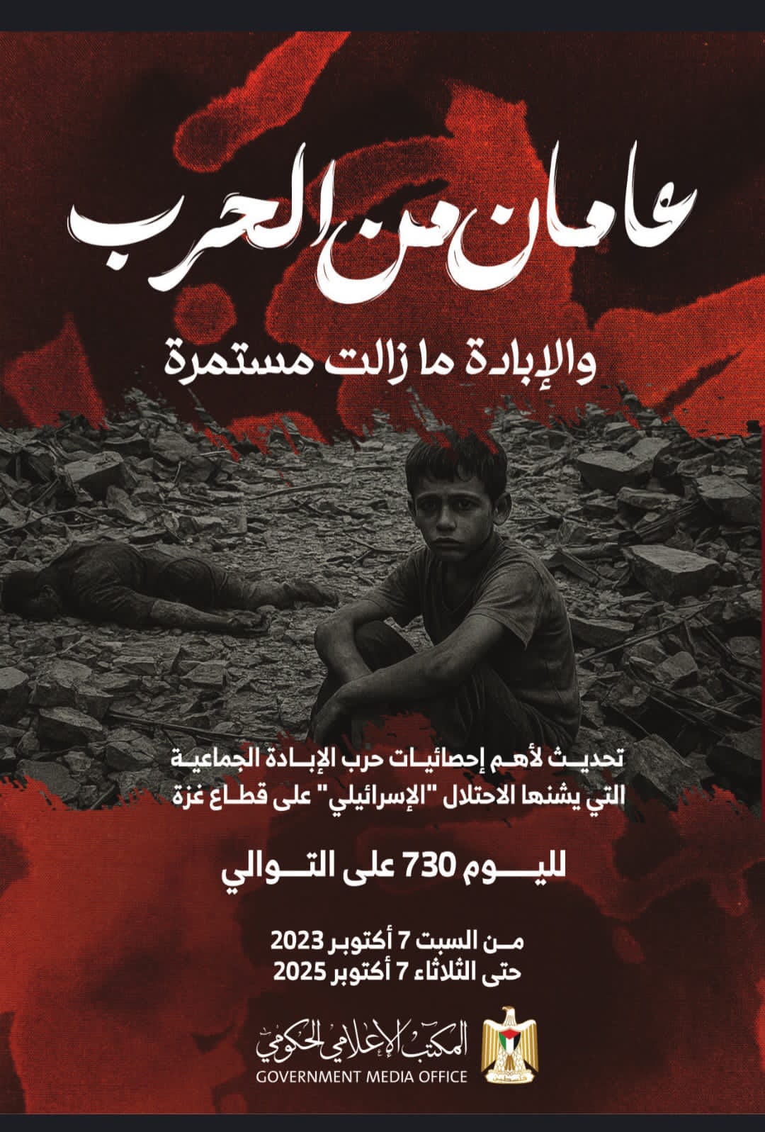 أصدر المكتب الإعلامي الحكومي في قطاع غزة بياناً شاملاً بمناسبة مرور عامين كاملين على حرب الإبادة الجماعية التي يواصل جيش الاحتلال الإسرائيلي ارتكابها ضد أبناء الشعب الفلسطيني في القطاع منذ 7 أكتوبر 2023 وحتى 5 أكتوبر 2025، كاشفاً عن حصيلة مأساوية تُجسّد حجم الكارثة الإنسانية غير المسبوقة التي حلّت بغزة وسكانها البالغ عددهم أكثر من 2.4 مليون نسمة، والذين يتعرضون – بحسب البيان – لسياسات منظمة من الإبادة والتجويع والتطهير العرقي.