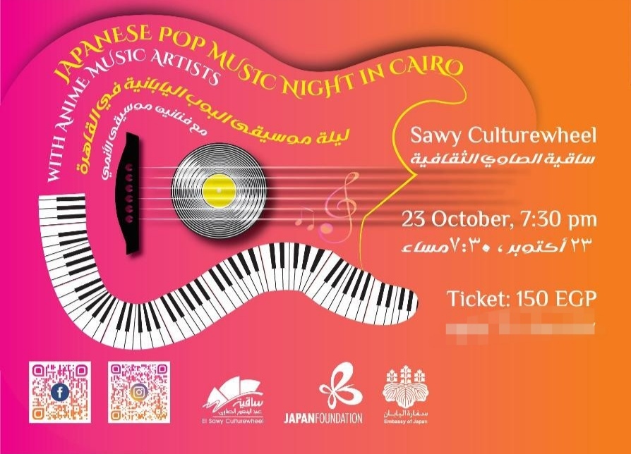 تحتفل مؤسسة اليابان بالقاهرة هذا العام بمرور 30 عامًا على تأسيسها، وبهذه المناسبة، يسُر مؤسسة اليابان بالقاهرة أن تعلن عن أقامتها حفلاً موسيقياً لأغاني الأنمي في مصر بعنوان “ليلة موسيقى البوب اليابانية في القاهرة – مع فنانين موسيقى الأنمي -” يوم الخميس الموافق 23 أكتوبر وذلك احتفالاً أيضاً بالمؤتمر الدولي التاسع لتنمية أفريقيا TICAD9 الذي عٌقد في أغسطس 2025، ليكون بمثابة جسر للتبادل الثقافي بين اليابان ومصر.