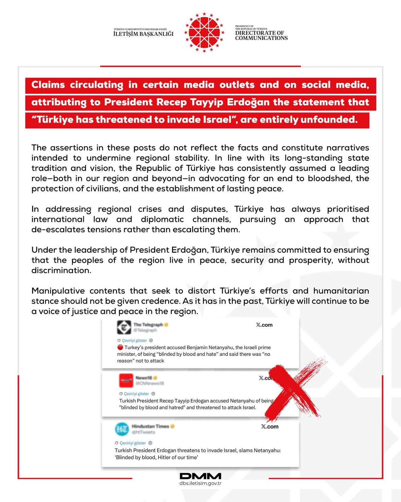 أكد البيان إنّ الادعاءات المنسوبة إلى رئيس الجمهورية التركية السيد رجب طيب أردوغان في بعض وسائل الإعلام ومنشورات مواقع التواصل الاجتماعي، والتي تزعم أن “تركيا تهدد إسرائيل بالغزو”، لا أساس لها من الصحة.