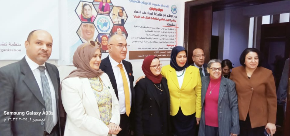 بمناسبة اليوم العالمي لمناهضة العنف ضد النساء عقد اتحاد الإعلاميين الأفريقي الآسيوي ندوة تحت عنوان “دور الإعلام في مناهضة العنف ضد النساء “، بحضور نخبة متميزة من الخبراء والقيادات النسائية من ٨ دول عربية، هي فلسطين والسودان وسوريا والجزائر والأردن ومصر واليمن وموريتانيا