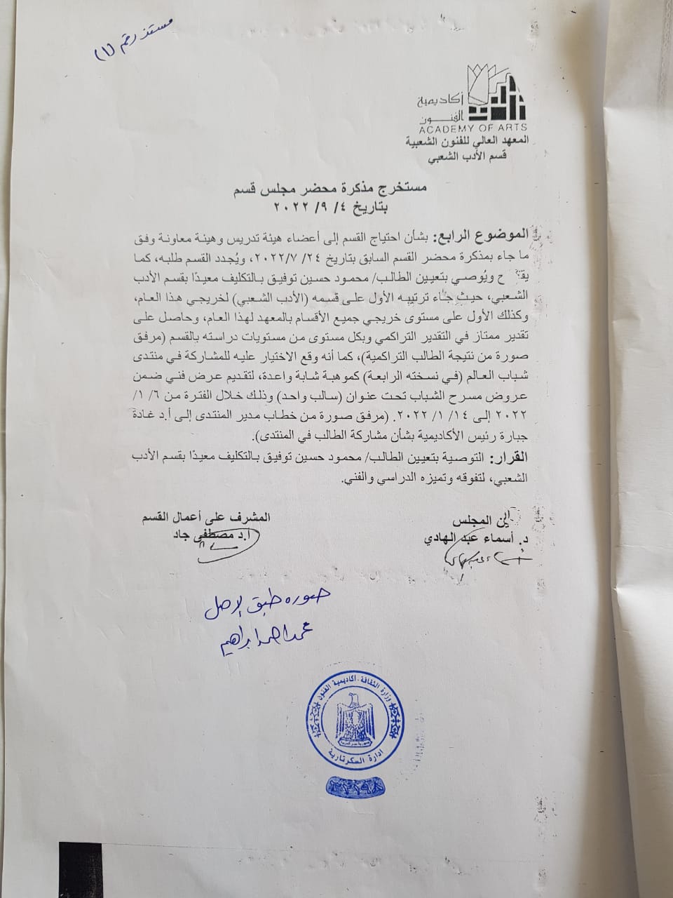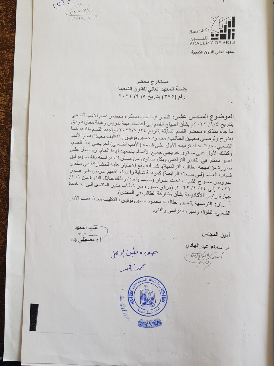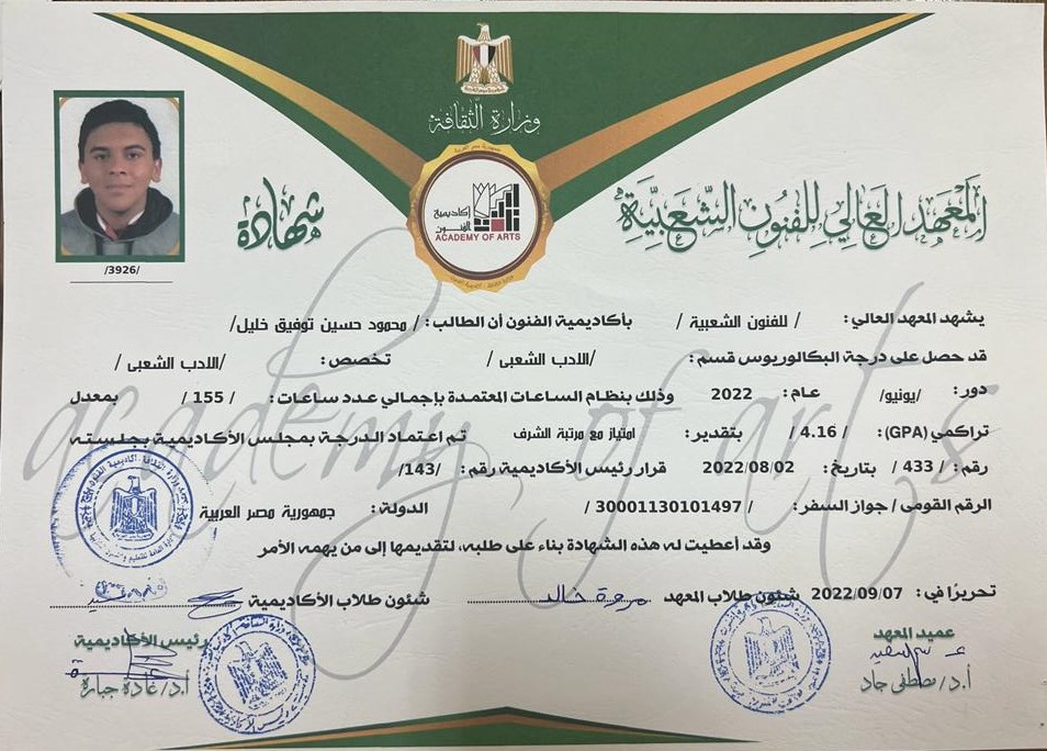 محمود حسين توفيق نموذج صارخ لهذا الظلم. شاب وباحث متميز، الأول على دفعته طوال أربع سنوات دراسية، وحاصل على تقدير عام «امتياز مع مرتبة الشرف» من المعهد العالي للفنون الشعبية. مجلس القسم أوصى صراحة بتعيينه معيدًا بالتكليف، ومحضر المعهد أكد الحاجة الشديدة إليه نظرًا لتميزه الأكاديمي والبحثي والفني. ورغم ذلك، واجه تعنتًا غير مبرر من أكاديمية الفنون بالقاهرة، تم خلاله تجاوز اللوائح والقوانين، وتعيين من هم أقل منه تقديرًا، بل ومن معاهد وأقسام أخرى، في تحيز واضح لاعتبارات جغرافية وبلدية، في تحدٍ صريح لمبدأ العدالة وتكافؤ الفرص.