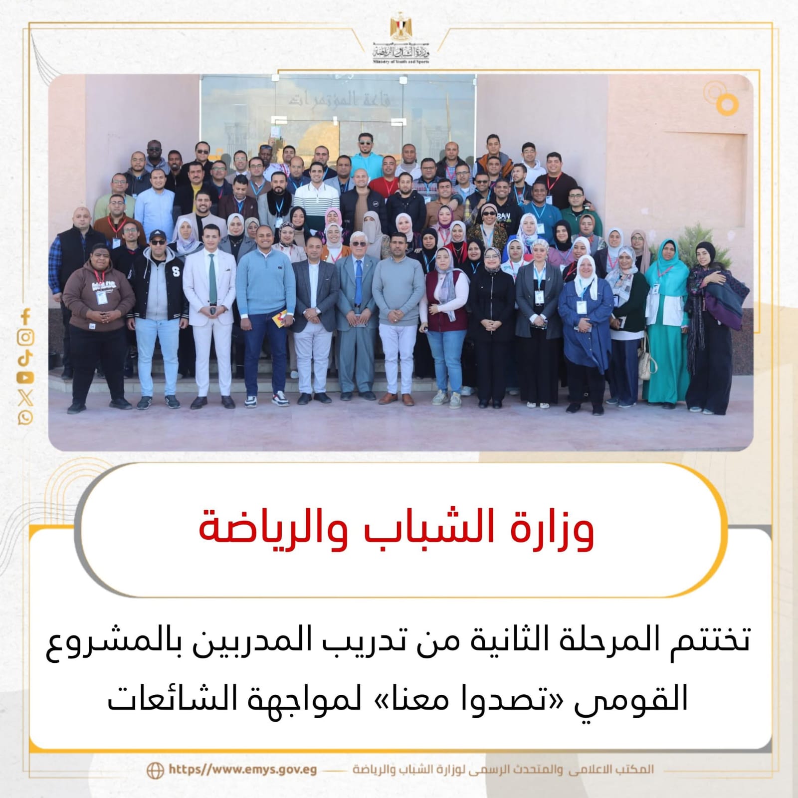 وشهدت الدورة مشاركة 100 متدرب من 16 محافظة، في إطار المشروع القومي الذي انطلق عام 2020، والذي يهدف إلى تأهيل الكوادر الشبابية لمواجهة الشائعات وتعزيز الوعي المجتمعي ودعم التماسك الداخلي.