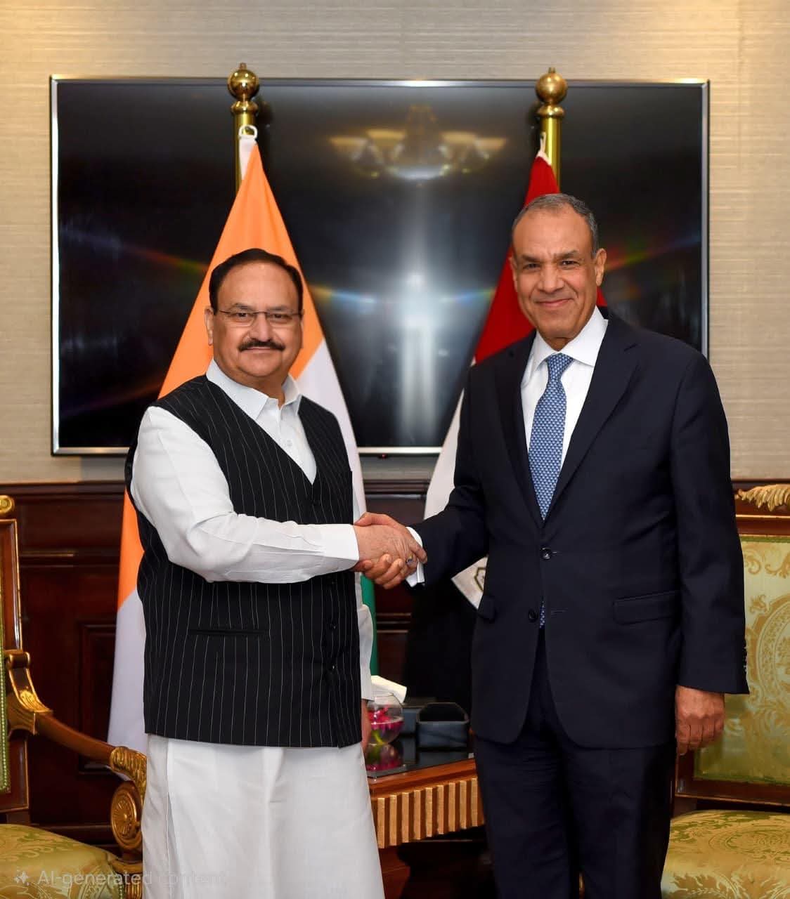التقى الدكتور بدر عبد العاطي، وزير الخارجية والهجرة وشئون المصريين بالخارج، يوم الاثنين 10 نوفمبر، بالسيد جاغات براكاش نادا، وزير الصحة والكيماويات والأسمدة ورئيس حزب بهاراتيا جاناتا الحاكم بالهند، وذلك خلال زيارته إلى القاهرة للمشاركة في النسخة الثالثة من المؤتمر العالمي للسكان والصحة والتنمية البشرية، الذي تنظمه وزارة الصحة والسكان خلال الفترة من 9 إلى 12 نوفمبر.