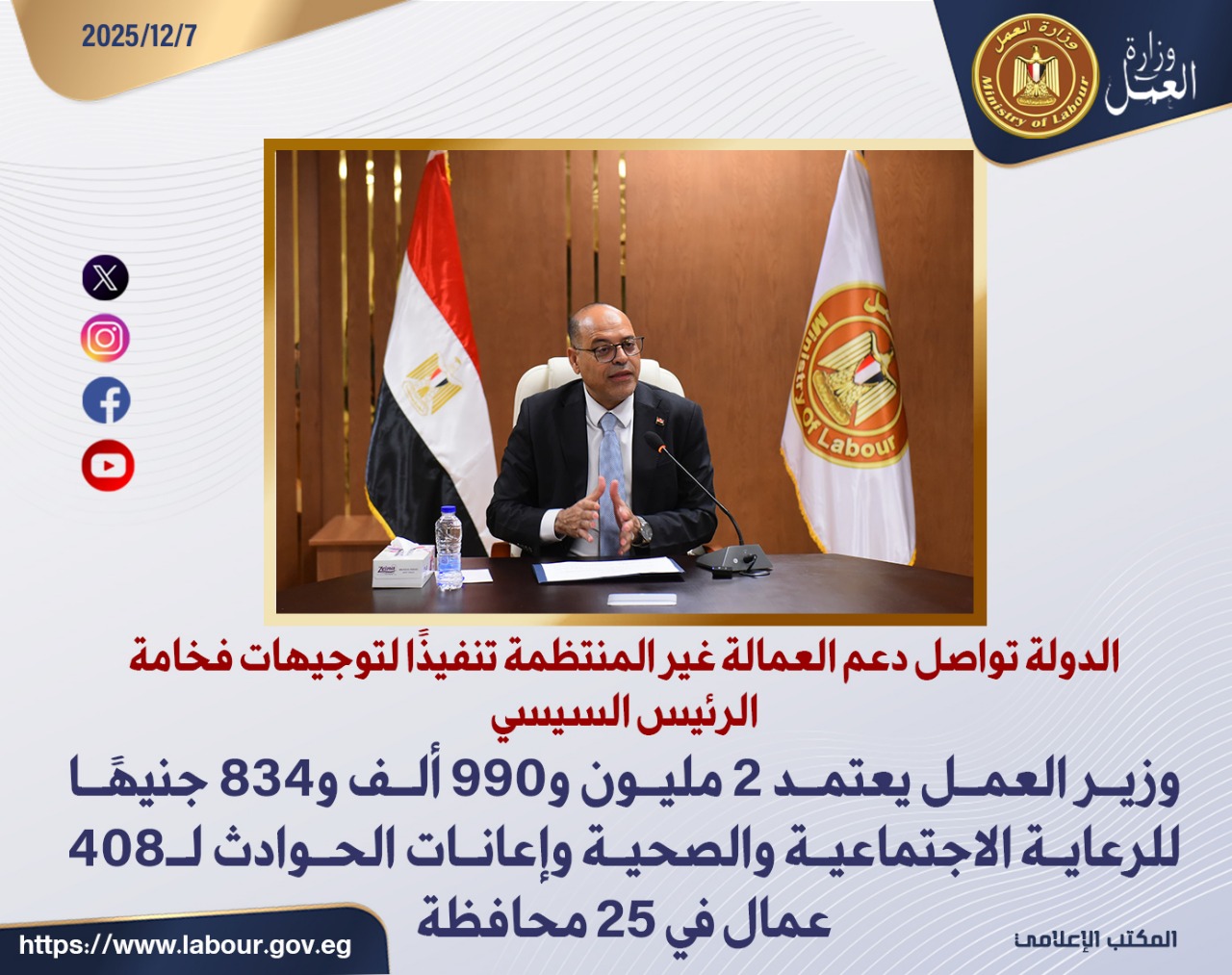 وشدد وزير العمل على استمرار الوزارة في تقديم كافة أوجه الدعم والرعاية للعمالة غير المنتظمة بجميع المحافظات، تنفيذًا لتوجيهات القيادة السياسية، موضحًا أن هذه المساعدات تأتي في إطار التزام الدولة بتوفير حياة كريمة للفئات الأكثر احتياجًا، وتأكيدًا على توسيع مظلة الحماية الاجتماعية لتصل إلى كل مستحق.