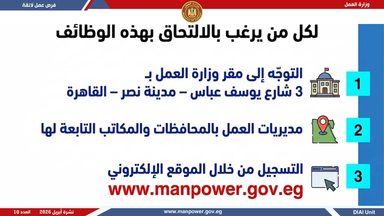 وأكدت الوزارة أن التقديم يتم من خلال الإدارة العامة للتشغيل بمقر الوزارة القديم في مدينة نصر، أو عبر مديريات العمل بالمحافظات، أو بالتواصل المباشر مع الشركات المُعلنة، وكذلك من خلال الموقع الرسمي للوزارة.